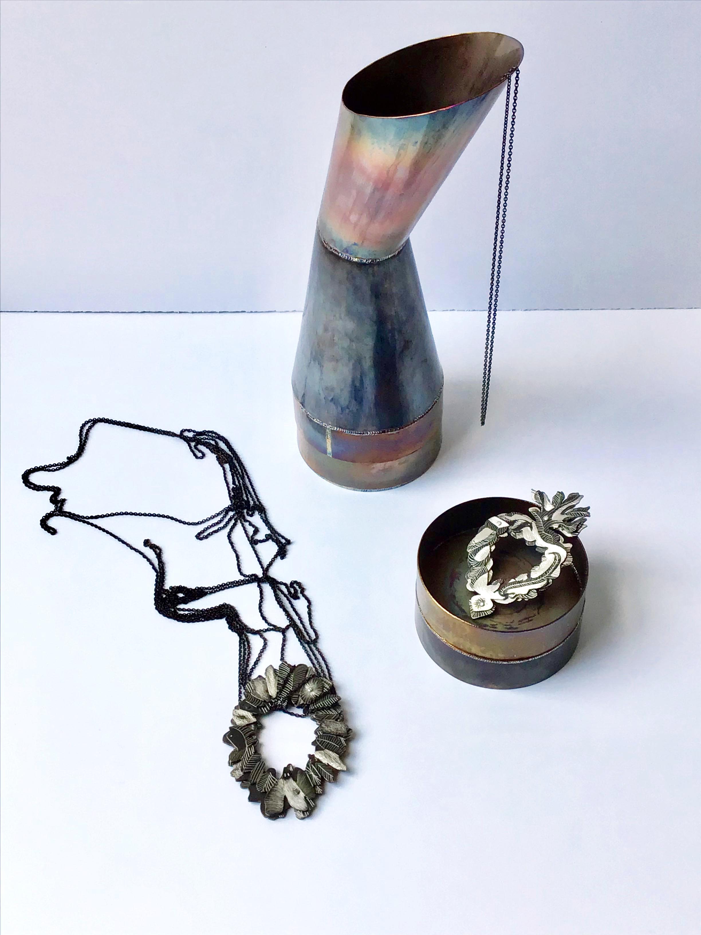 Die Wechselwirkung zwischen einem Objekt und dem umgebenden Raum untersuchten 30 Künstlerinnen der GEDOKmünchen im Rahmen des schmuckundhülle-Projektes über einen Zeitraum von vier Jahren. Seit 2016 fanden sich in jedem Jahr acht Teilnehmerinnen aus unterschiedlichen Sparten der angewandten Kunst zu Paaren zusammen, um einen Spannungsbogen zwischen Schmuck und Hülle zu schlagen. Aus dieser Zusammenarbeit entwickelten sich völlig neue Objekte, die die traditionelle Bedeutung der Begriffe von „Schmuck“ als tragbarem, also mobilem Objekt und der statischen „Hülle“ aufheben. In allen Interpretationen vereinen sich Objekt und Umgebung zu einem symbiotischen Ganzen. Die Hülle wirkt schützend und wertschätzend zugleich – der kostbare Inhalt unterstreicht ihre eigenständige Ausdrucksform. Formvariation, Materialfülle und Farbenvielfalt der Einzelstücke sprengen die herkömmlichen Grenzen. Die teilnehmenden Künstlerinnen überspannen den Bereich von Objektkunst über Buchbinderei, Glas und Licht, Gold- und Silberschmiedekunst, Holzbildhauerei, Keramik-, Leder-, Papier- bis Textil-Kunst.